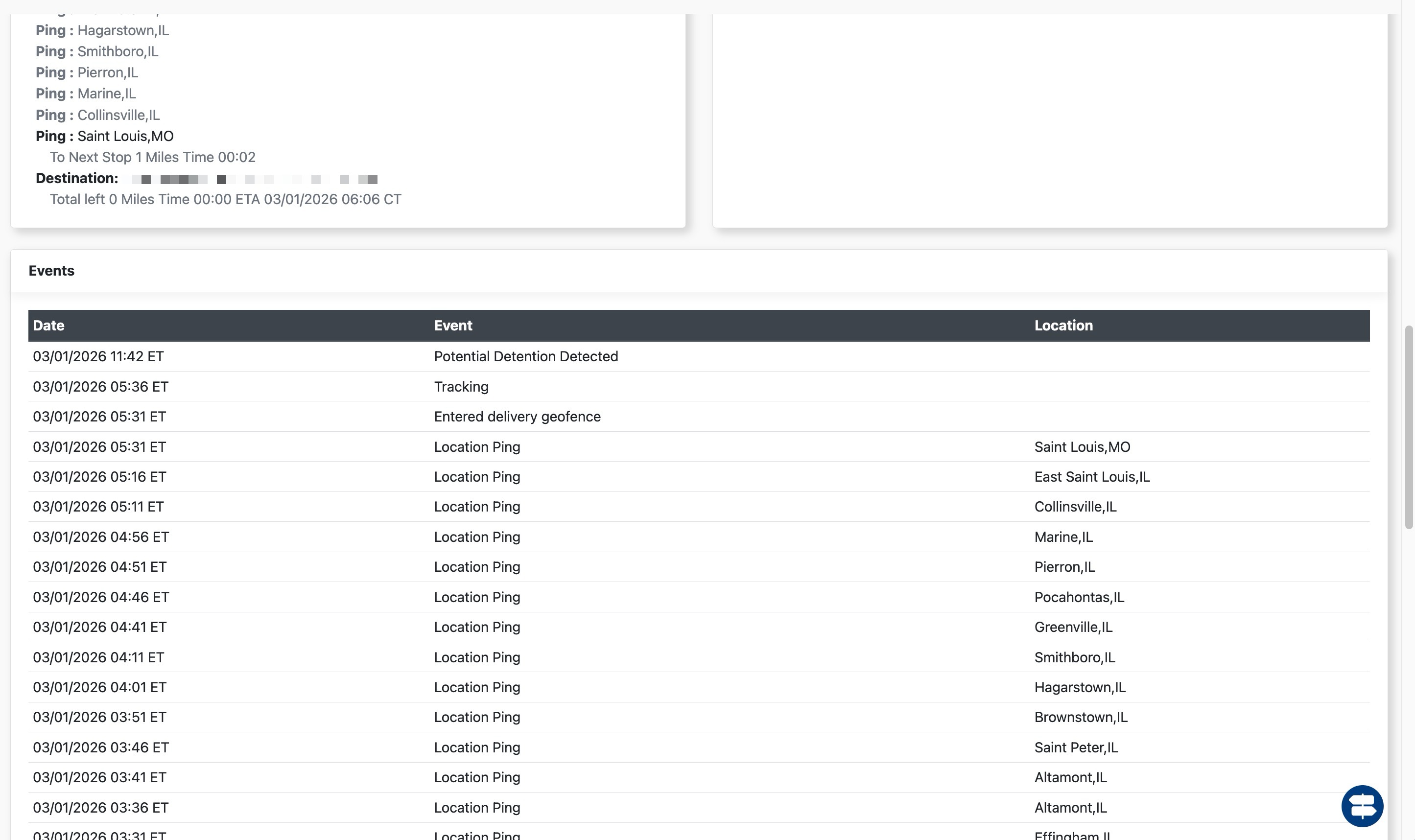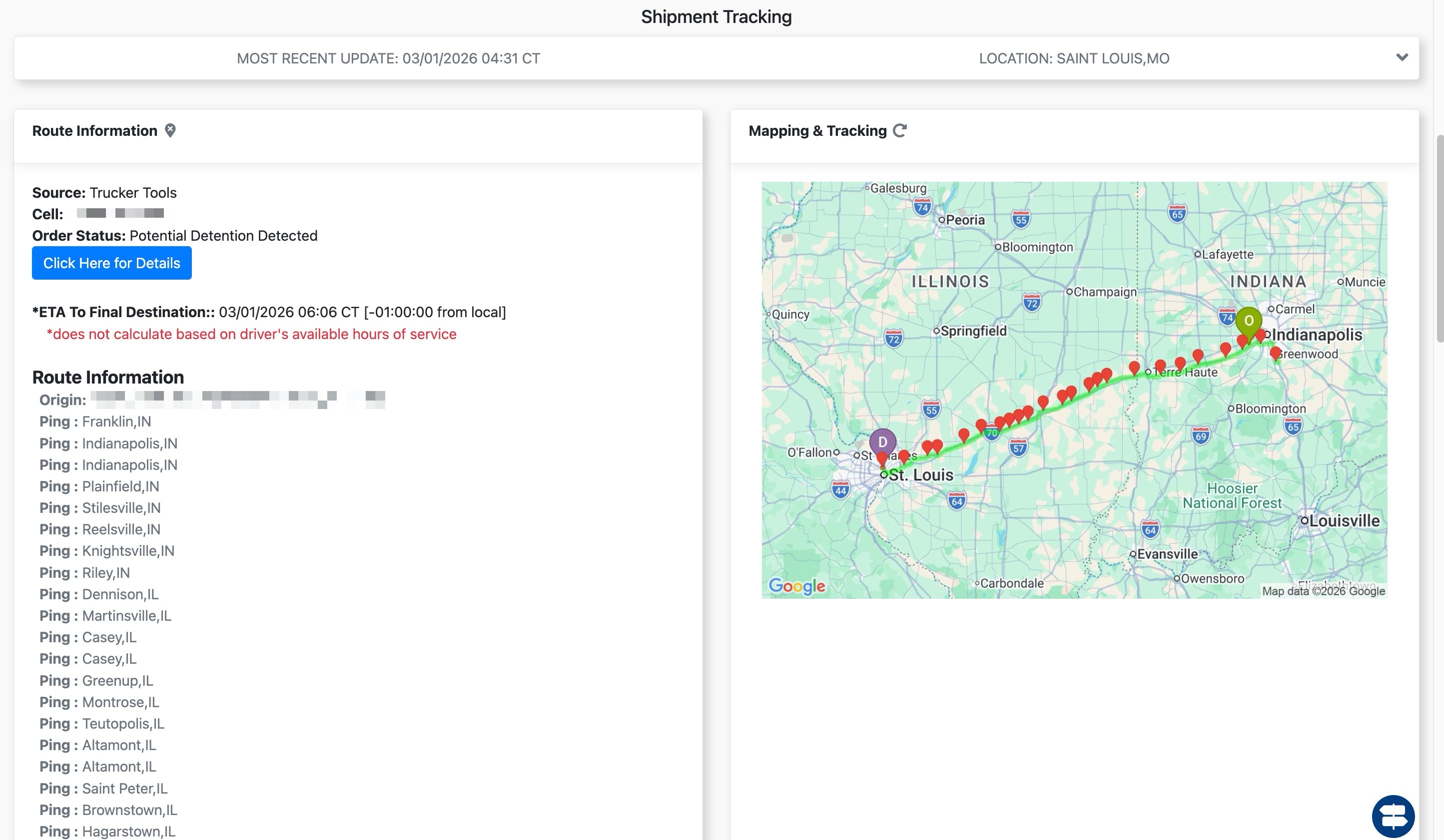Step 4 - Once a driver accepts the tracking request and initiates the tracking, within the load profile will be a list of ping details. There is a blue button that will direct you to the trucker tools website portal with additional tracking and map information.