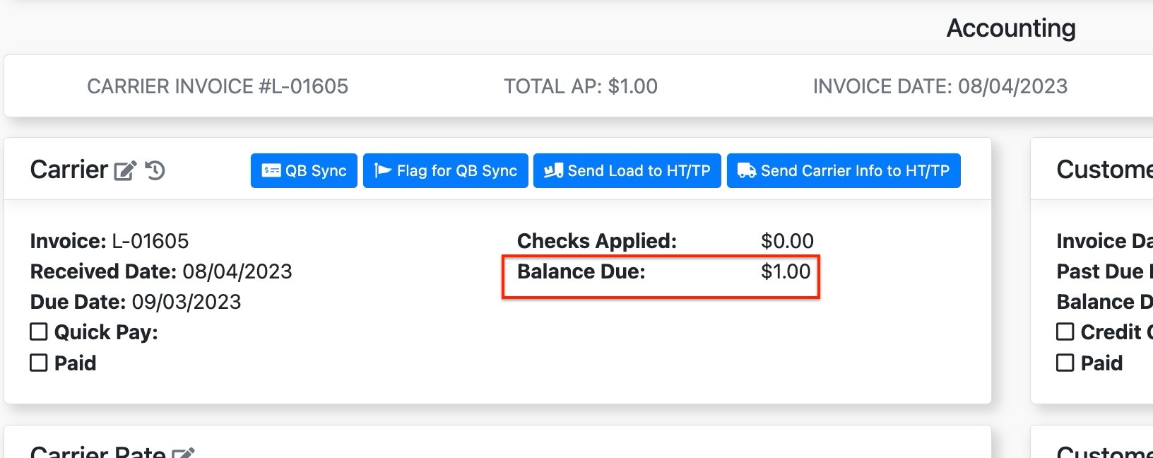 If the Invoice # remains entered and the Balance Due is greater than $0.00, the next QuickBooks sync will recreate the Carrier Bill in QBO