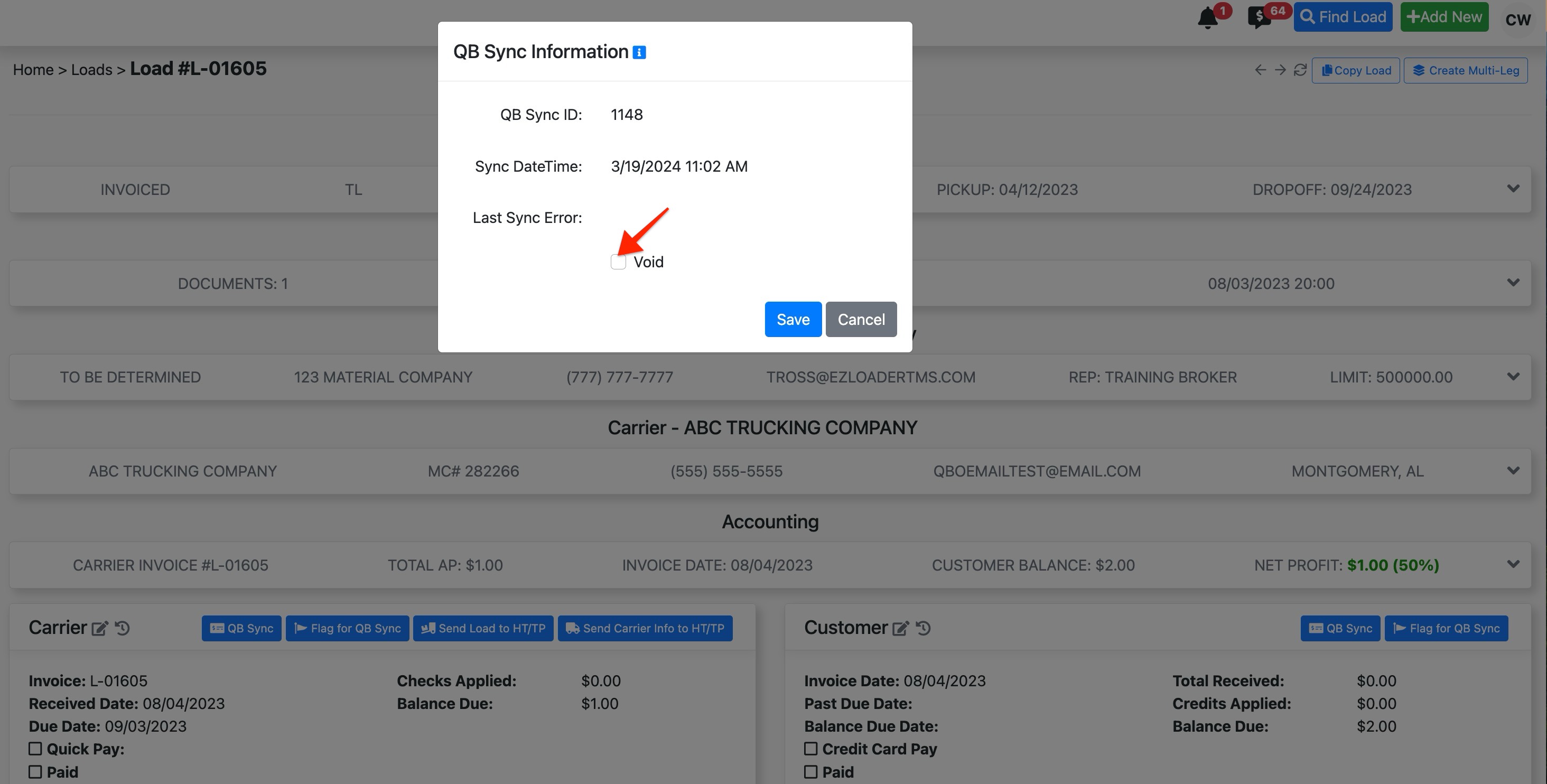 - Use the Void checkbox in the Load > Accounting > Carrier > QB Sync icon