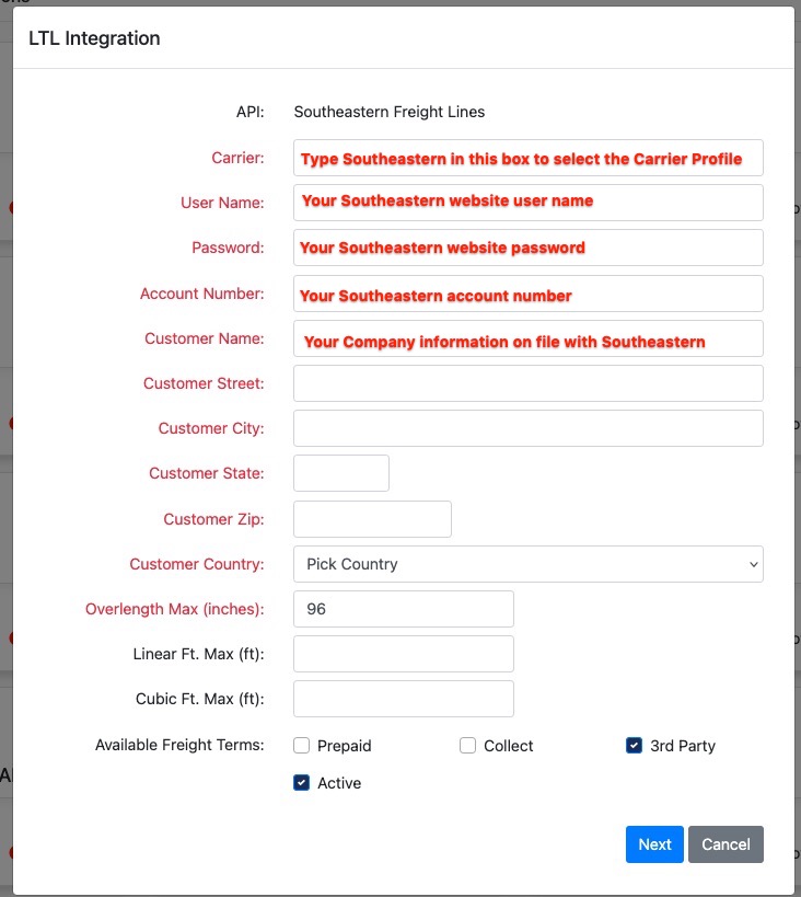 - In the New Carrier window, add the basic Carrier information. Click the blue Save button to save the Carrier profile